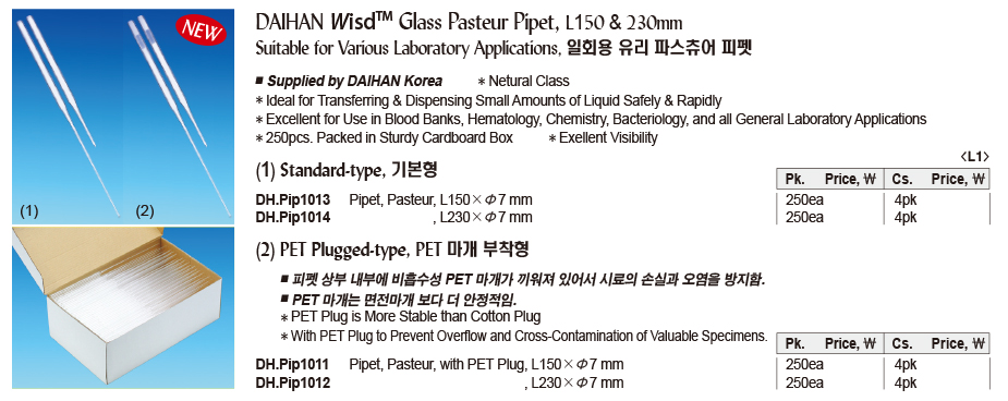 DAIHAN® WisdTM Glass Pasteur Pipet, L150 & 230mm Suitable for Various Laboratory Applications, 일회용 유리 파스츄어 피펫
