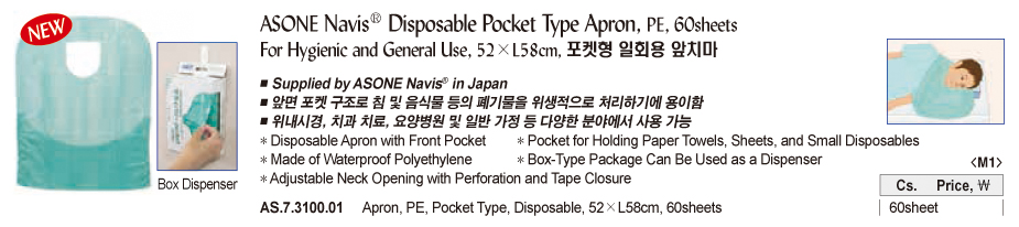 ASONE Navis® Disposable Pocket Type Apron, PE, 60sheets For Hygienic and General Use, 52×L58cm, 포켓형 일회용 앞치마