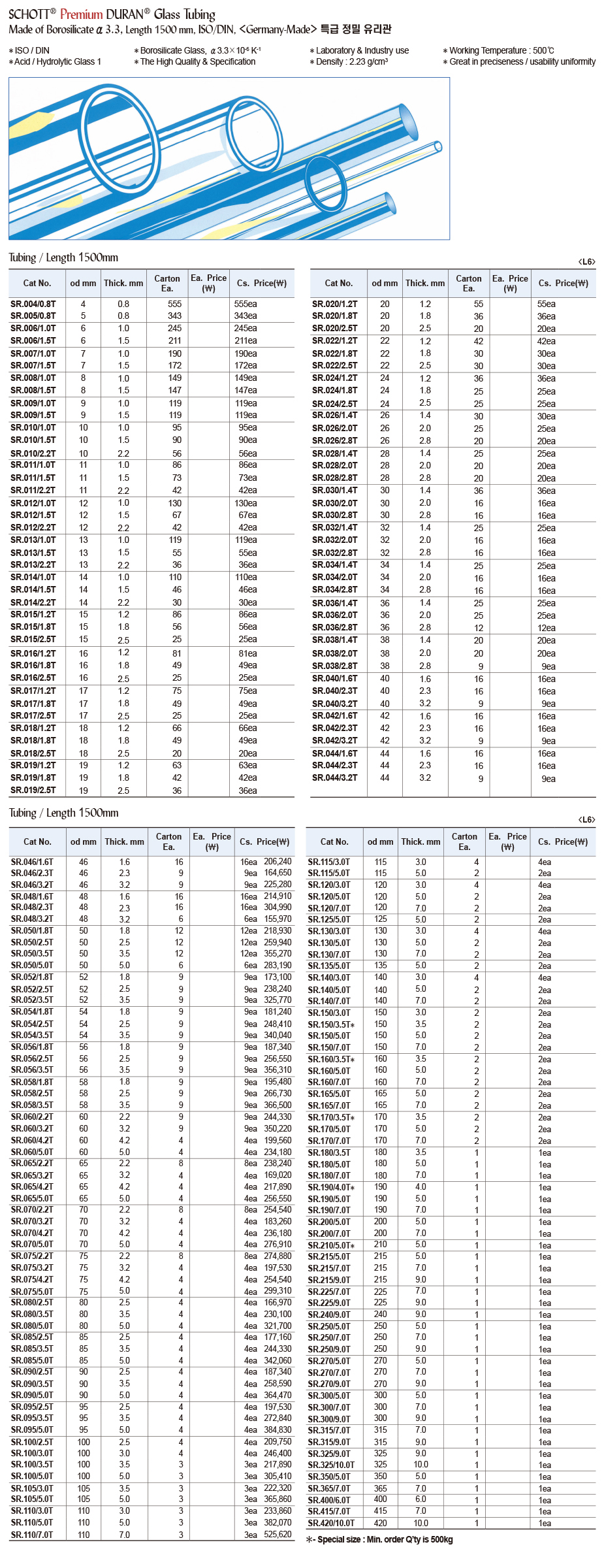 SCHOTT® Premium DURAN® Glass Tubing Made of Borosilicateα3.3, Length 1500 mm, ISO/DIN, 특급 정밀 유리관