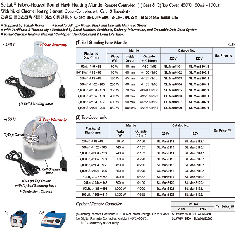 SciLab® Fabric-Housed Round Flask Heating Mantle, Remote Controlled, (1) Base & (2) Top Cover, 450℃, 50㎖~100Lit With Nickel Chrome Heating Element, option-Controller, with Certi. & Traceability 라운드 플라스크용 직물케이스 히팅맨틀, Ni-Cr 열선 내장, 자력교반기와 사용가능, 조절기와 외장 온도 프로브 별도