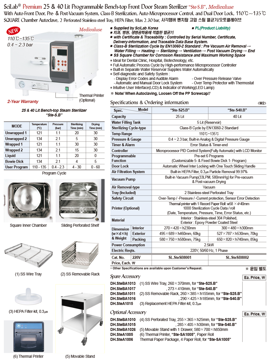 SciLab® Premium 25 & 40 Lit Programmable Bench-top Front Door Steam Sterilizer “Ste-S.B”, Medicaluse With Auto-Front Door, Pre- & Post-Vacuum System, Class-B Sterilization, Auto-Microprocessor Control, and Dual Door Lock, 110℃~135℃ SQUARE Chamber Autoclave, 2 Perforated Stainless-steel Tray, HEPA Filter, Max 2.30 bar, 사각챔버 벤치탑 고압 스팀 멸균기/오토클레이브
