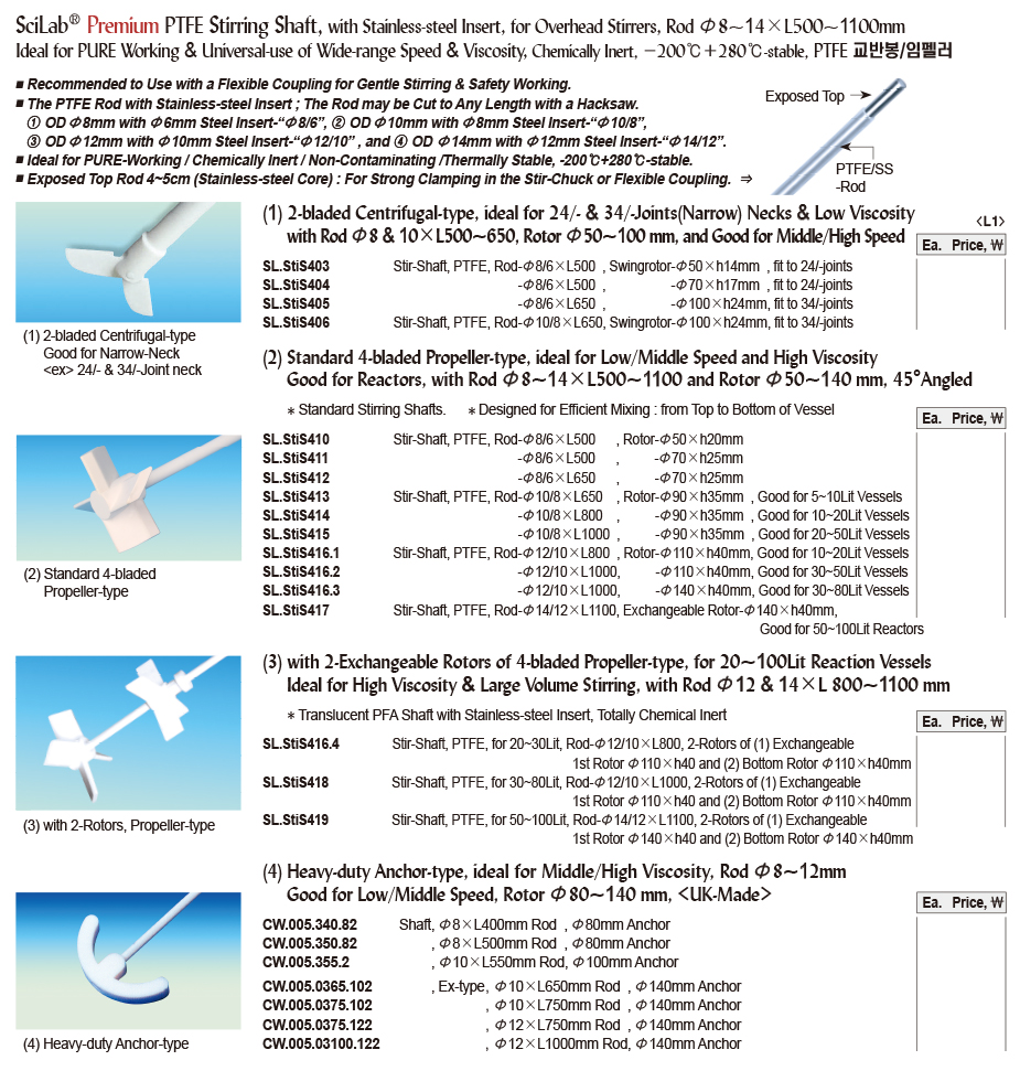 SciLab® Premium PTFE Stirring Shaft, with Stainless-steel Insert, for Overhead Stirrers, Rod Φ8~14×L500~1100mm Ideal for PURE Working & Universal-use of Wide-range Speed & Viscosity, Chemically Inert, -200°C+280°C-stable, PTFE 교반봉/임펠러