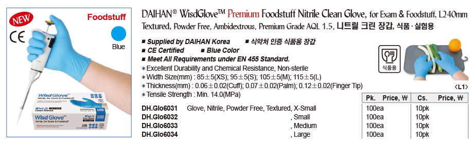 DAIHAN® WisdGloveTM Premium Foodstuff Nitrile Clean Glove, for Exam & Foodstuff, L240mm Textured, Powder Free, Ambidextrous, Premium Grade AQL 1.5, 니트릴 크린 장갑, 식품·실험용